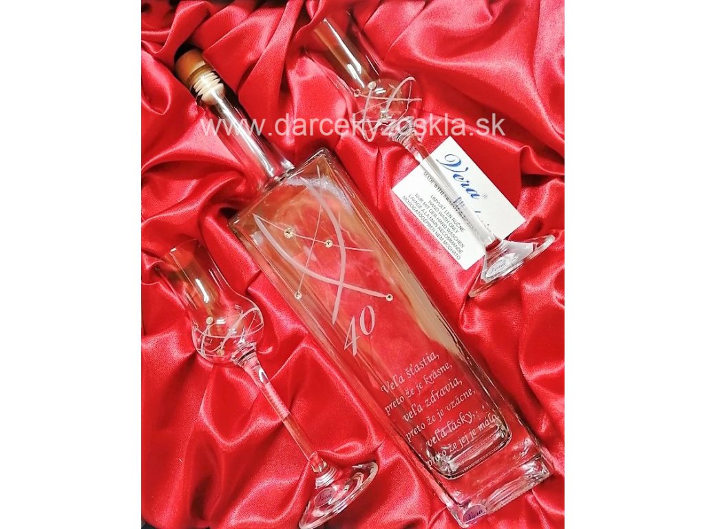 Elegantná darčeková sada s brúseným dekorom doplnený Swarovski® Elements. Cena je za 1ks fľašu 700ml a 2ks pohárikov 70ml. Sada je zabalená v elegantnom balení.