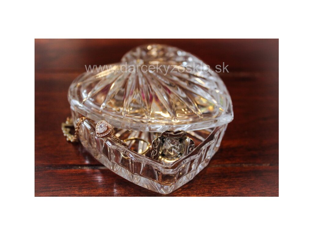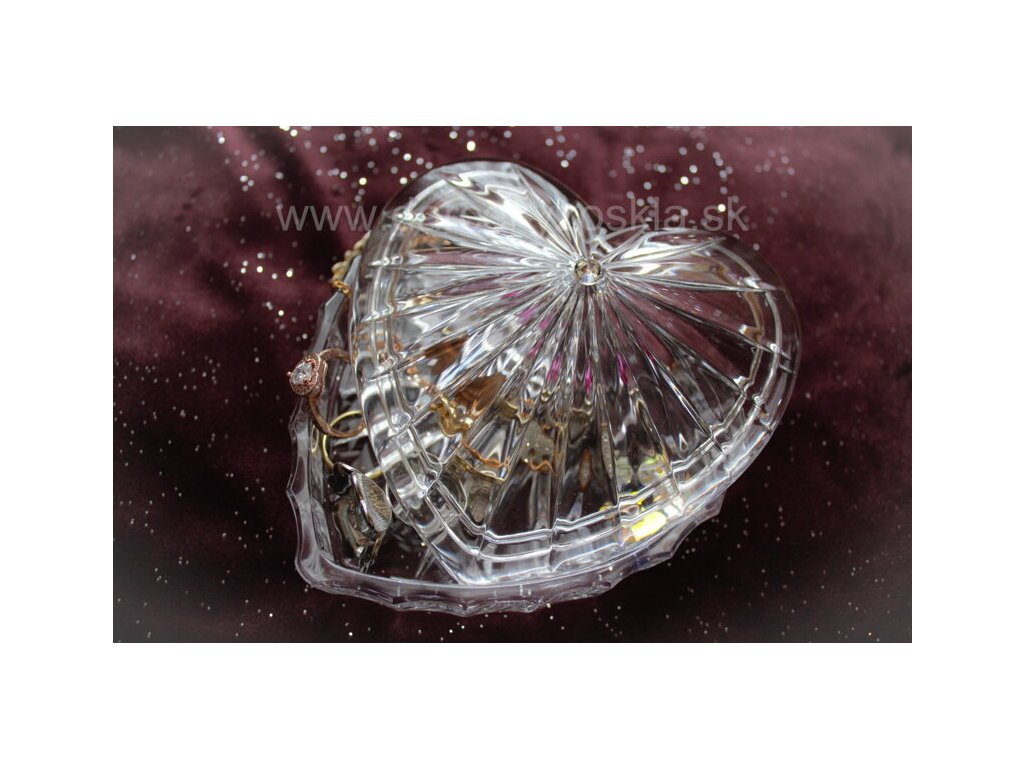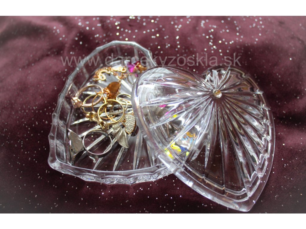 Sklenená dáza v tvare srdca na šperky decentne zdobená krištálom Swarovski. Slúži na prstene, naušnice, retiazky prípadne iné menšie šperky. Je zložená z dvoch častí, samotná dóza a vrchnák.