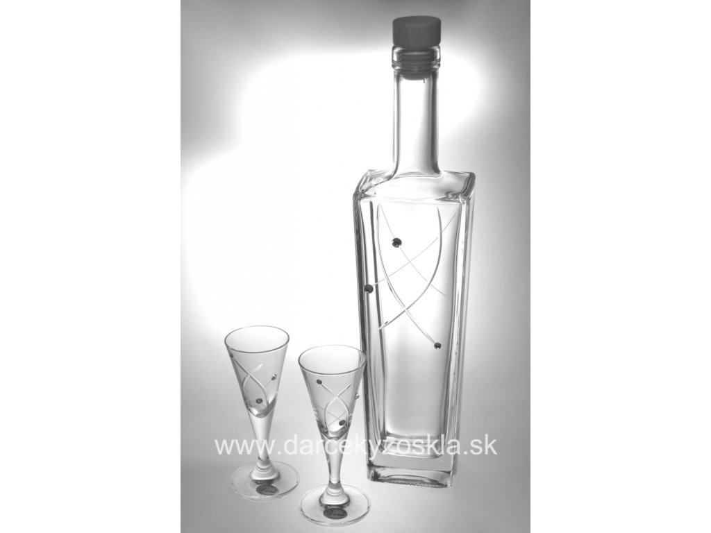 Elegantný set na likér s vybrúseným matným a lešteným dekorom, ktorý je doplnený krištáľmi SWAROVSKI . Set pozostáva zo 6ks pohárov 30ml a 1ks fľaše 500ml Cana je za balenie. Výška pohára je 115mm.