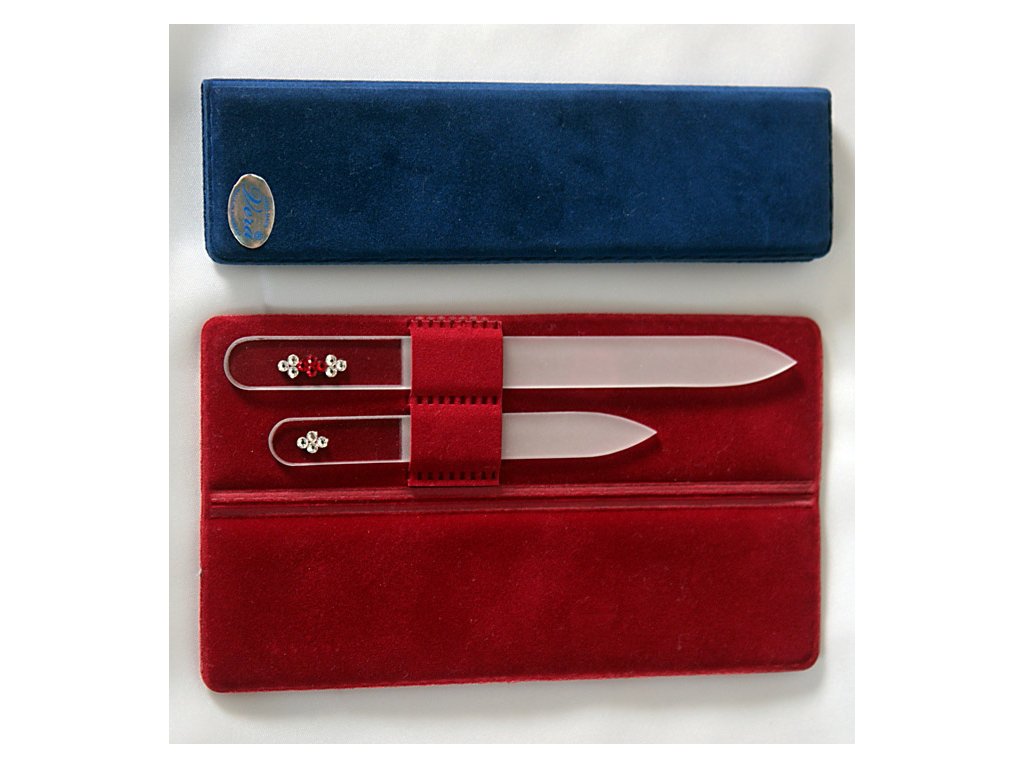 Luxusné balenie 2ks pilníkov (1x90mm+1x135mm) v príjemnom semišovom púzdre. Púzdro je pevné, preto sa hodí na každodenné používanie a nosenie v kabelke. Jeho farba môže byť červená, modrá, zelená alebo čierna. Pilníky sú zdobené SWAROVSKÉHO krištáľmi, ktoré môžu byť vo farebnej kombinácii krištáľová/červená alebo krištáľová/modrá.Je to obľúbený darček, ktorý poteší každú ženu.
