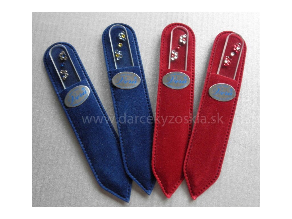 Luxusné balenie 2ks pilníkov (1x90mm+1x135mm) v príjemnom semišovom púzdre. Púzdro je pevné, preto sa hodí na každodenné používanie a nosenie v kabelke. Jeho farba môže byť červená, modrá, zelená alebo čierna. Pilníky sú zdobené SWAROVSKÉHO krištáľmi, ktoré môžu byť v nasledovných farebných prevedeniach:krištáľová/červenákrištáľová/modráčervená/krištáľováslabomodrá/žltáJe to obľúbený darček, ktorý poteší každú ženu.