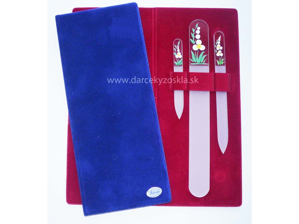 Luxusné balenie 3ks pilníkov (1x90mm+1x135mm+1x190mm) v príjemnom semišovom púzdre. Púzdro je pevné, preto sa hodí na každodenné používanie a nosenie v kabelke. Jeho farba môže byť červená, modrá, zelená alebo čierna. Vybrať si môžete so šiestich dekorov.Je to obľúbený darček, ktorý poteší každú ženu.