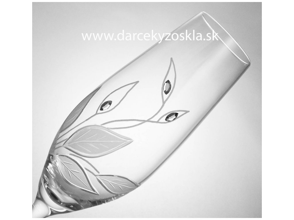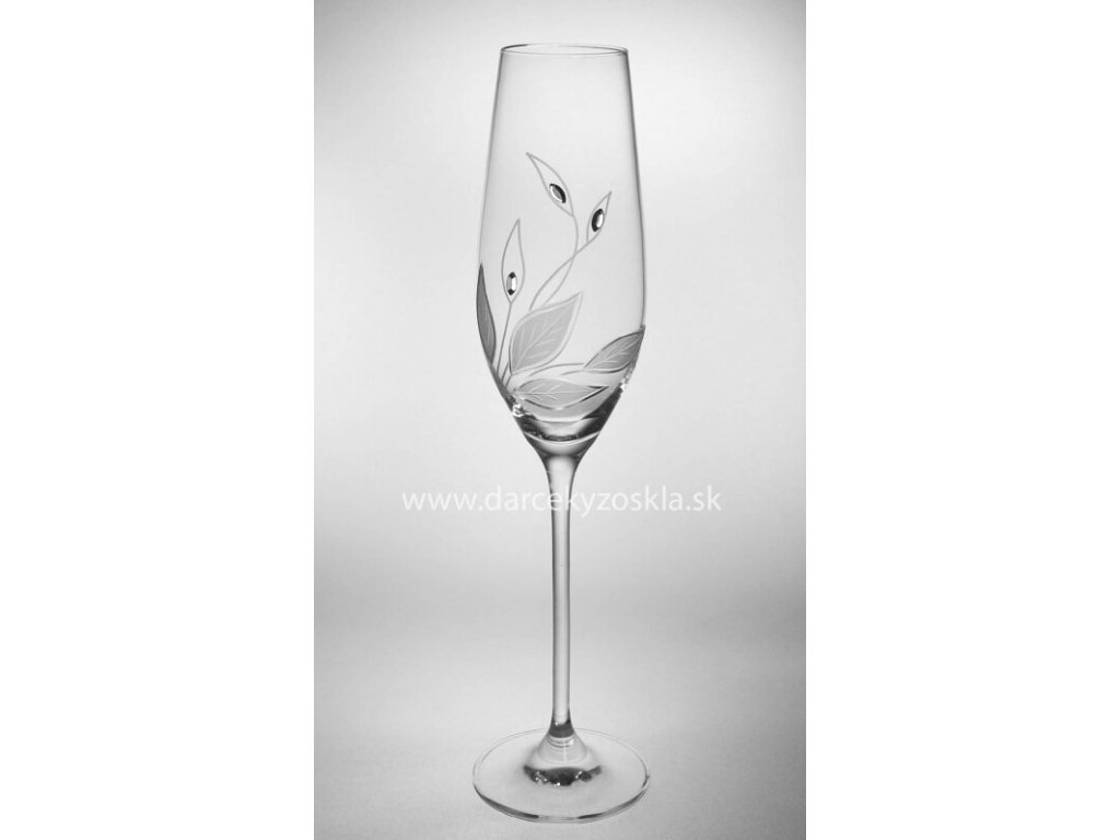 Poháre s brúseným dekorom, ktorý je doplnený krištáľmi SWAROVSKI . Poháre sú zabalené v elegantnom balení.Vybrať si môžete z troch variant pohárov podľa objemu kalicha (cena je rovnaká):210ml - používajú sa na šampanské (výška pohára je 265mm)360ml - používajú sa na biele víno (výška pohára je 225mm)470ml - používajú sa na červené víno (výška pohára je 240mm)Cana je za balenie. V jednom balení je 6ks.