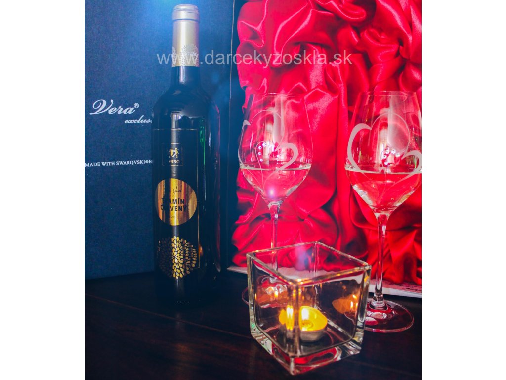 K pohárom dostanete kvalitné biele víno Tramín červený MOVINO a to všetko v elegantnom darčekovom balení.