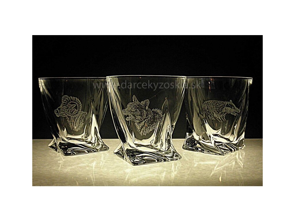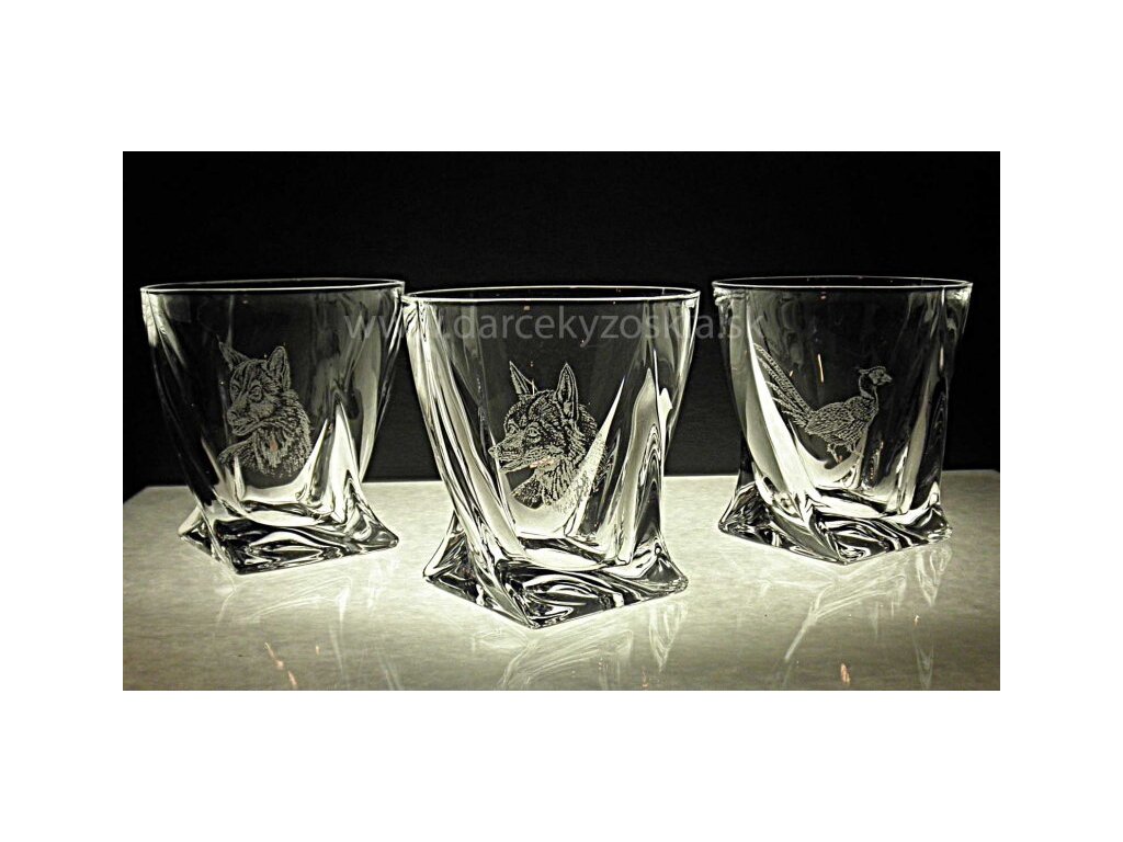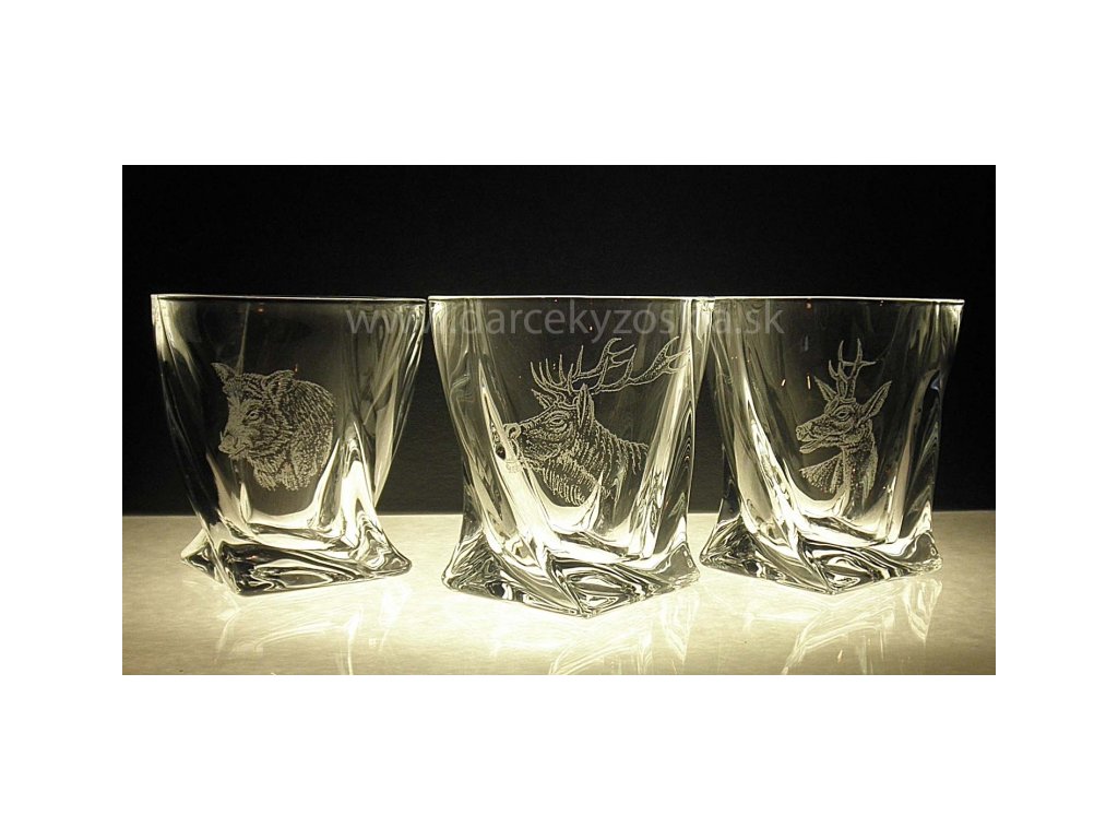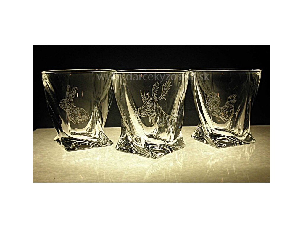 Elegantná sada 6ks pohárov 340ml. Set je zabalený v luxusnej saténovej krabici. Na pohároch sú ručne vygravírované obrázky poľovníckej zveri. Gravírovanie je zahrnuté v cene.