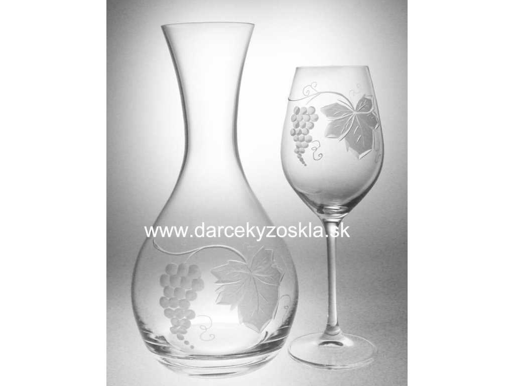 Poháre a karafa s vybrúseným matným a lešteným dekorom hrozna. Poháre aj karafa sú zabalené v elegantnom balení.Vybrať si môžete z dvoch variant pohárov podľa objemu kalicha (cena je rovnaká):360ml - používajú sa na biele víno (výška pohára je 225mm)470ml - používajú sa na červené víno (výška pohára je 240mm)Karafa má objem 1200ml (výška 250mm).Cena je spolu za 6ks pohárov a 1ks karafa.