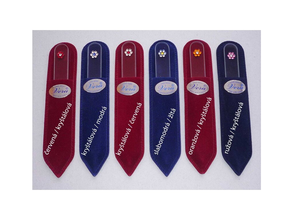 Sklenený pilník s elegantným dekorom zo SWAROVSKEHO krištáľov v tvare kvetinky Vybrať si môžete z množstva farebných kombinácií k čomu si môžete prispôsobiť aj farbu púzdra.