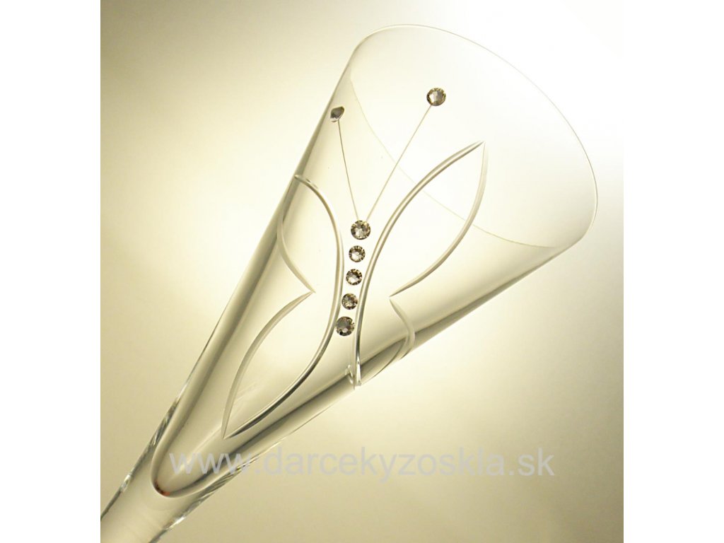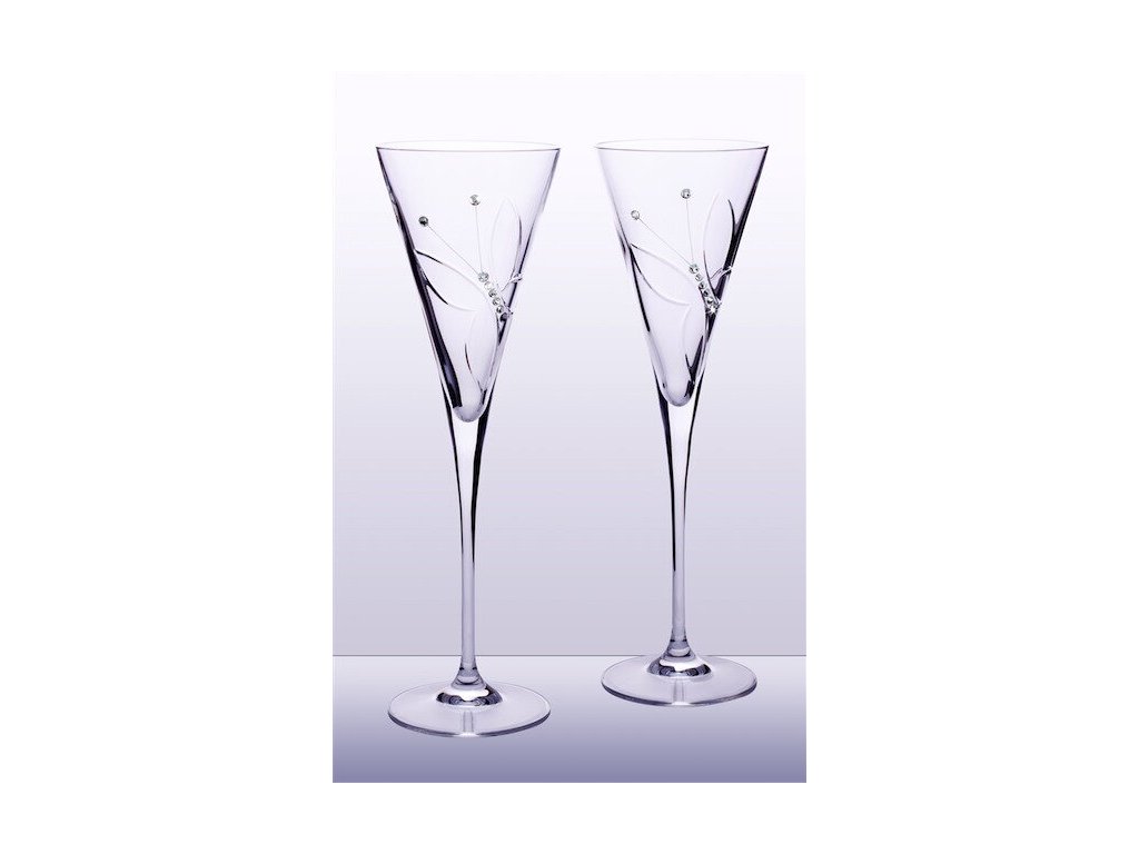 Elegantné svadobné poháre s lešteným dekorom motýľa doplnený krištáľmi SWAROVSKI . Objem pohára je 180ml a výška 260mm. Cena je za pár (2ks).