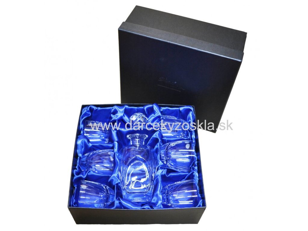 Elegantný whisky set, ktorý je zvýraznený jemným brúseným dekorom a krištálmi SWAROVSKI. Whisky set je zložený z 1 Karafy 700ml a 6ks pohárov 200ml. Set je zabalený v luxusnej saténovej krabici. Vhodný darček, ktorým určite potešíte každého muža.Ak chcete aby bol Váš darček originálny, môžete ho ozdobiť venovaním, ktoré bude vypiskované (gravírované). Toto venovanie môžete umiestniť na fľašu, poháre, prípadne decentne na štopeľ.