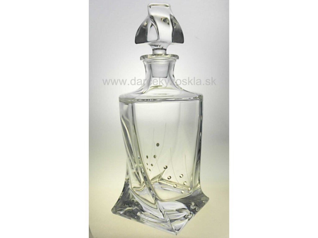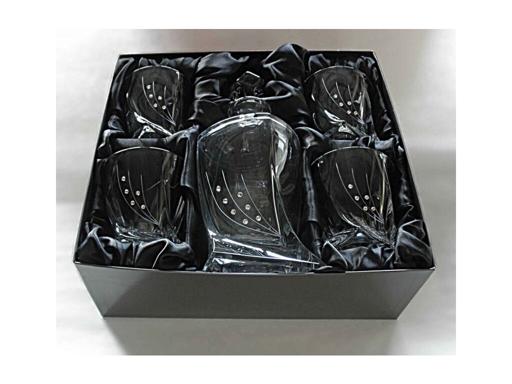 Elegantný Whisky set dekorovaný jemným brúseným dekorom a krištáľmi SWAROVSKI . Set pozostáva z 1 Karafy 850ml a 4 pohárov 340ml. Zabalený je v luxusnej saténovej krabici. Fľašu, prípadne aj poháre môžete doplniť originálnym popisom, ktorý bude vypieskovaný.